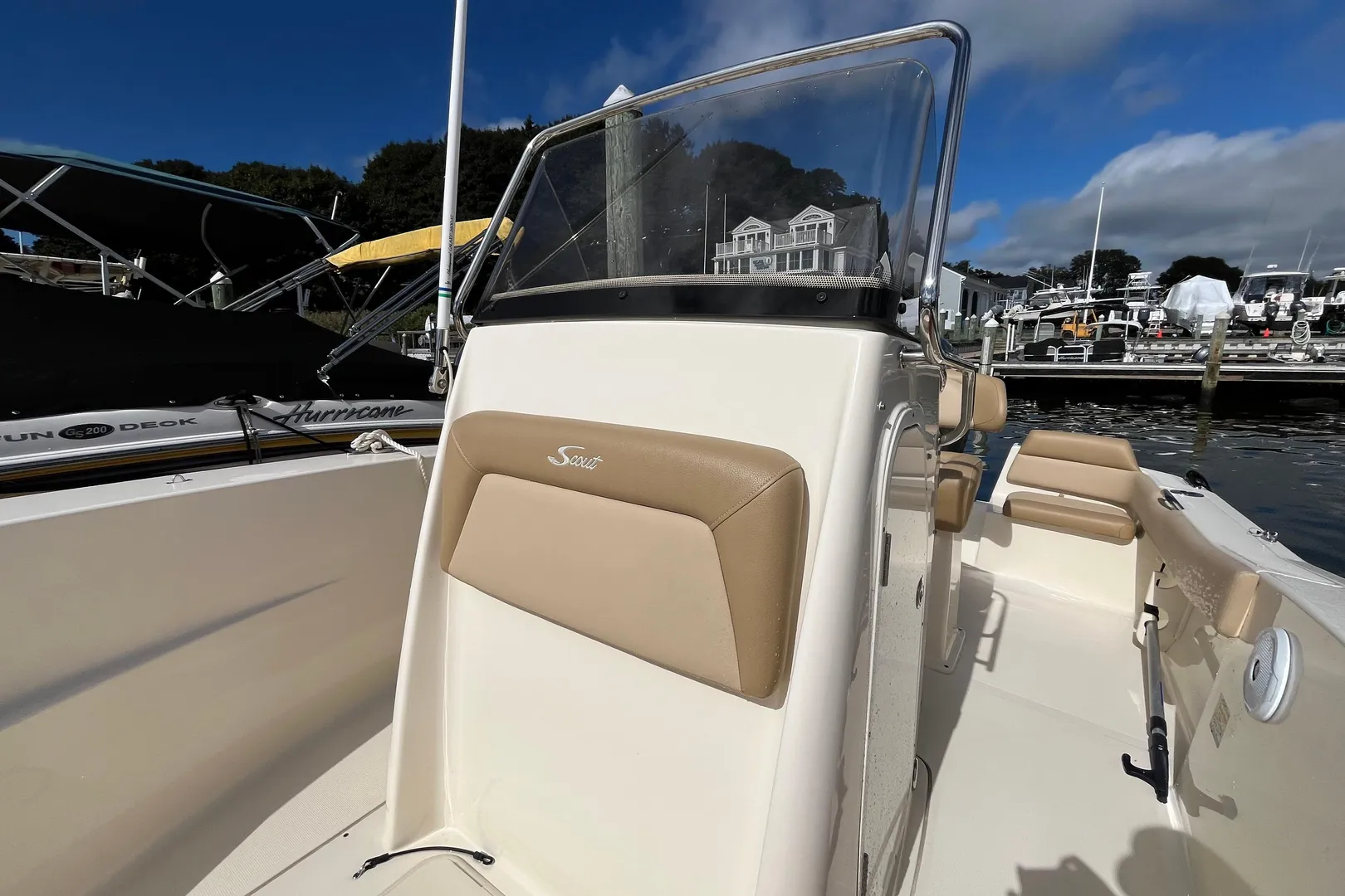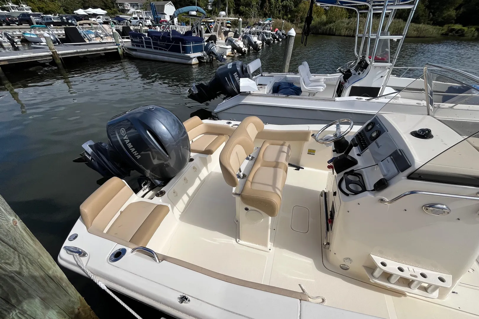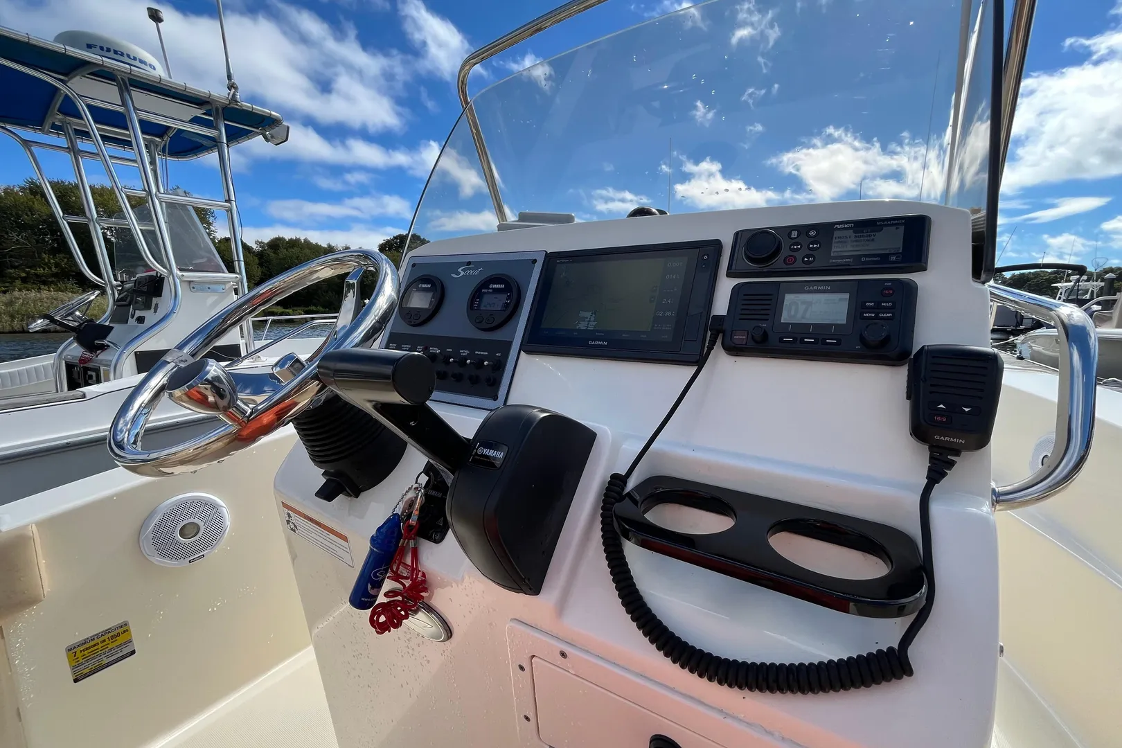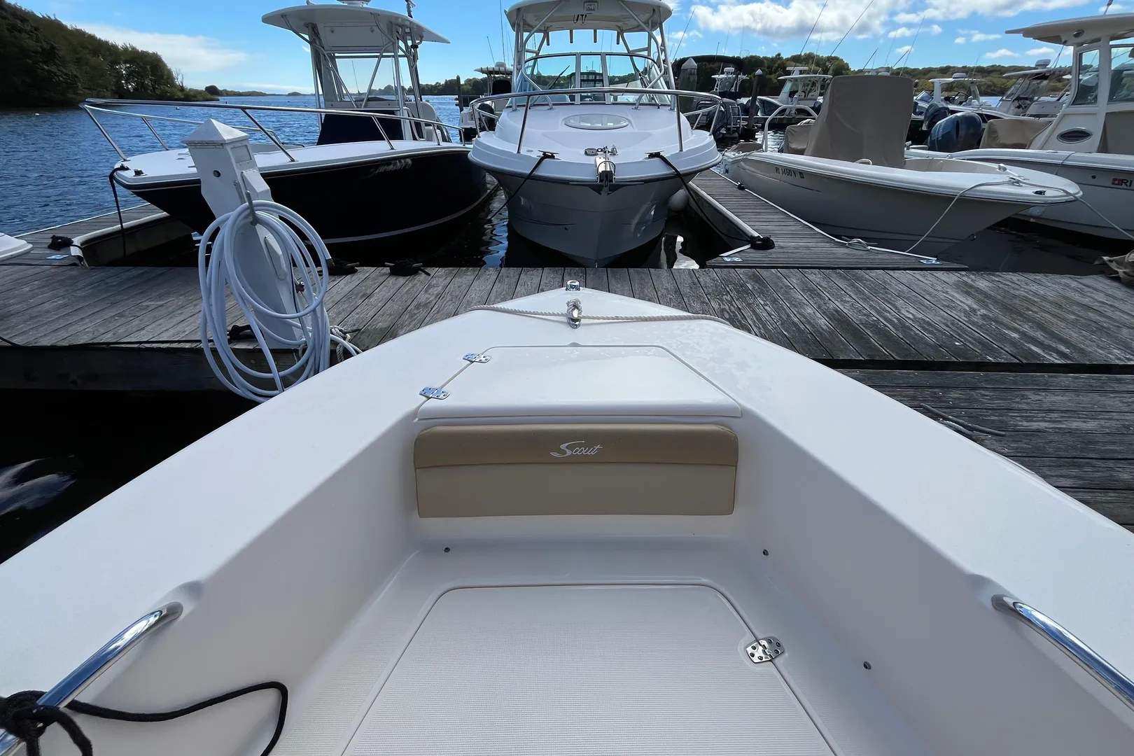 This 2020 Scout 195 Sportfish is powered with a Yamaha F150XB with just 56 hours. To complete the package there’s a Magic Tilt Aluminum Trailer with load guides and spare tire.