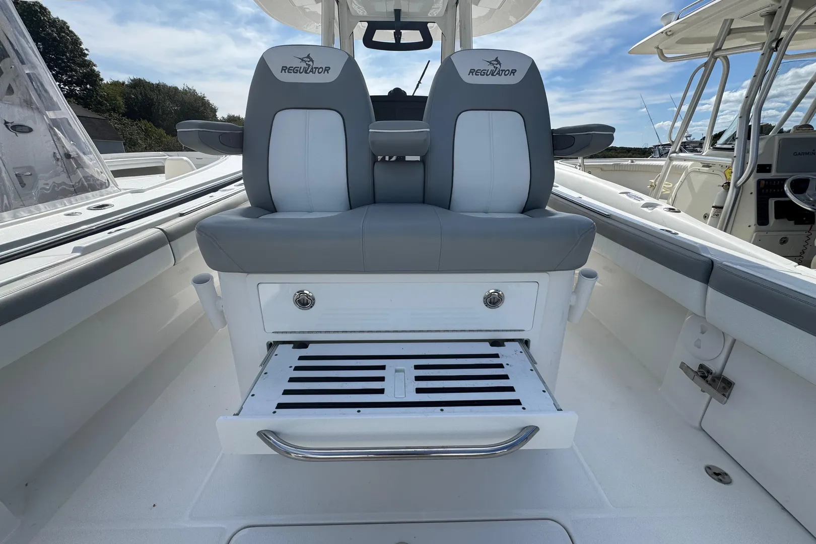 Welcome aboard the fastest boat in our fleet – reaching top speeds of 64 MPH when you opt for twin Yamaha 425s. Also available with twin 300s, the Regulator 31 overdelivers at every turn. Yamaha Helm Master® EX option gives you the power and flexibility to handle beautifully in any waters – and Seakeeper® 2 adds an extra element of stability offshore. Ready to fish? The massive cockpit, oversized tackle center, fishbox/livewell action, and optional Taco® Grand Slam 390 outrigger bases with 20’ Carbon Fiber telescoping poles deliver everything you need for a serious day of sportfishing. Upgrade to the 3X Deluxe Mezzanine Tackle Center for additional seating, storage, and dual-flanking rocket launchers that keep your rods at hand when the bite is hot. No matter how you outfit your ride, you’ll have plenty of deck space and offshore comforts including the starboard boarding and dive door, flip-up forward seat backrests, and optional forward sun shade and cockpit SureShade® to keep you cool in any waters.