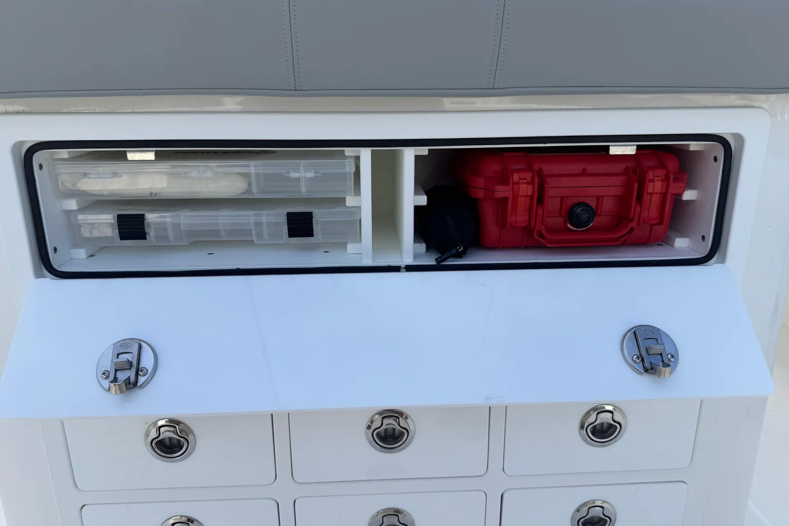 - 3X Deluxe Tackle Center: Helm Upholstered Companion Seating with Armrests and Flip-Up Bolsters with Individual Folding Footrests with SoftGrip Foot Rail; Seatback with Cup Holders and Rocket Launcher; (6) Medium Plano Trays; and (2) Tackle Drawers in Cabinet