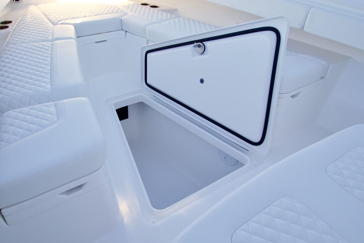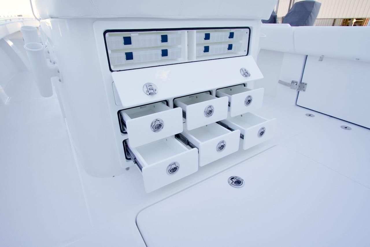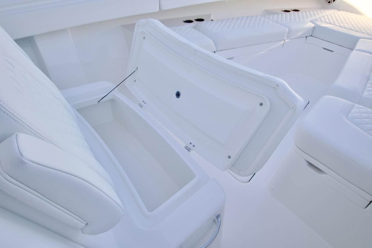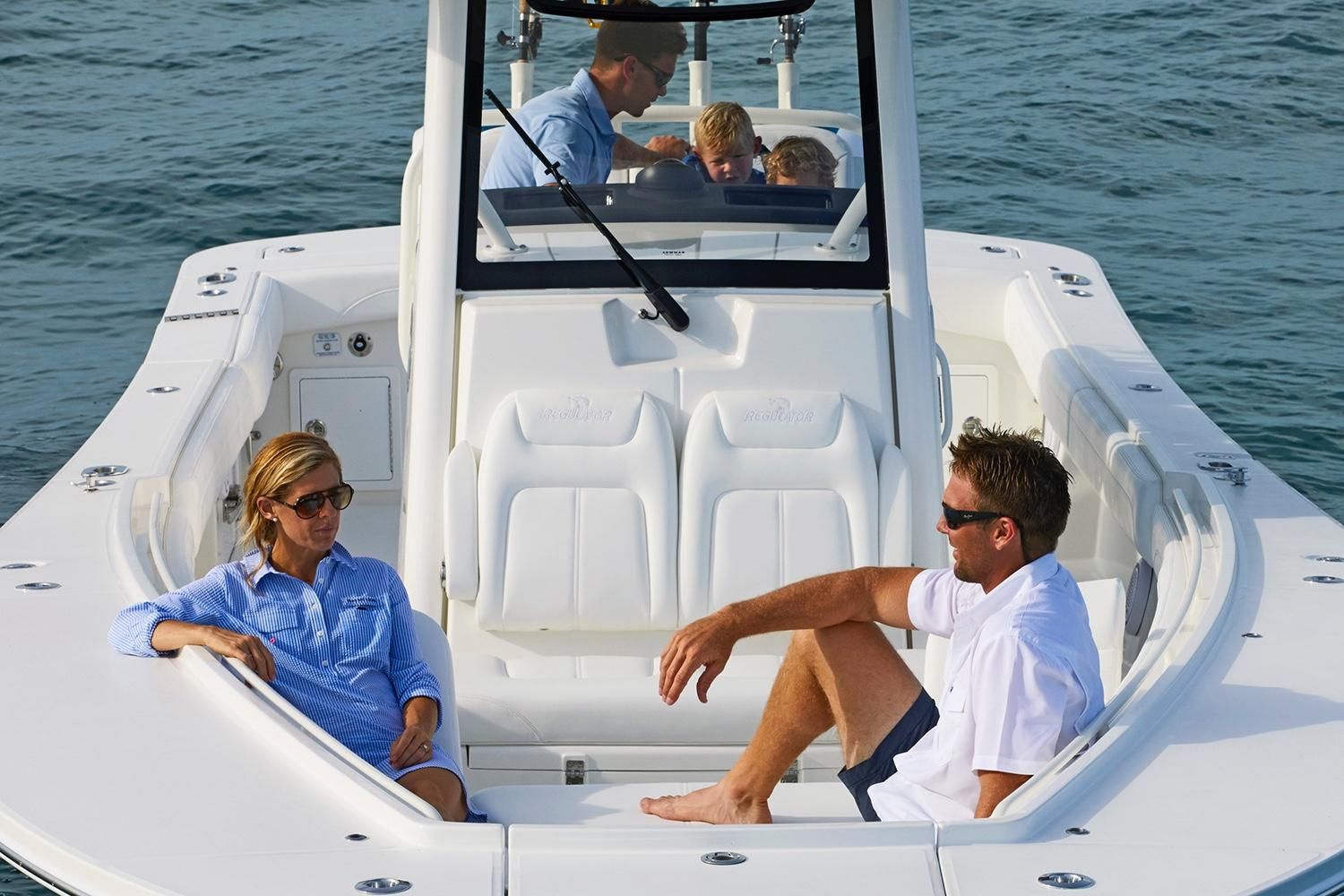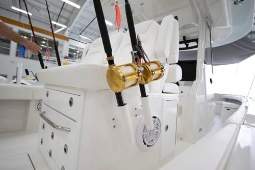 3X Deluxe Mezzanine Tackle Center with aft-facing seating for two, folding armrests, and tackle storage